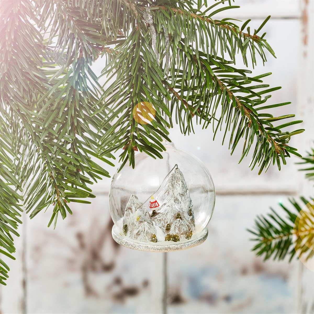 The Ski Mountain Dome Bauble is a glass ornament featuring a winter scene of a ski mountain inside a clear dome.