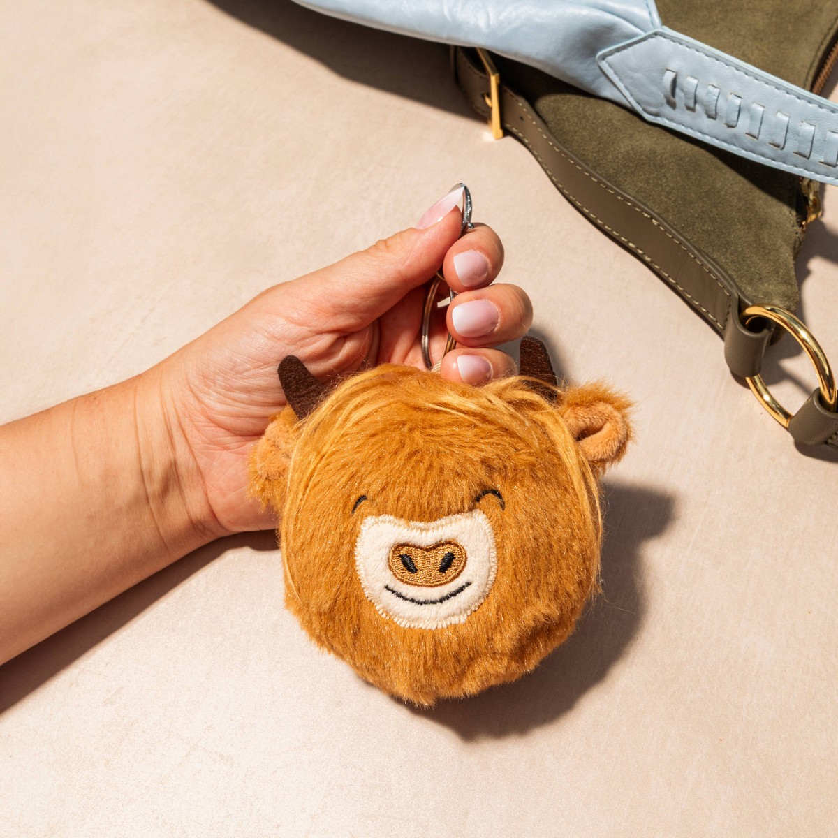 Flossie Highland Cow Stress Ball Bag Charm is a fun, squeezable accessory shaped like a Highland cow. Perfect for relieving stress and adding a whimsical touch to your bag or backpack.